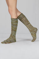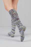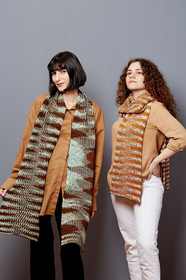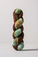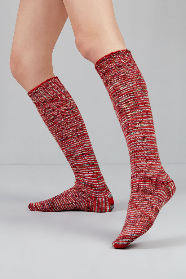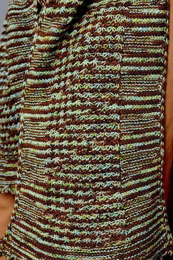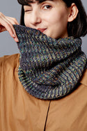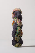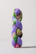 An intriguing combination of saturated solid plus exuberant speckled color, creating stripes that dance across needles and hooks in rhythmic combinations. A delightful challenge to combine Carmen into ‘engineered’ projects that purposely plan stripe placement.