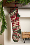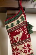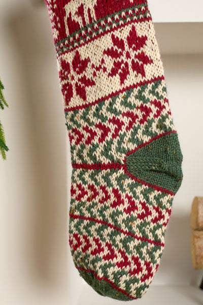 This stocking is knit in the round from the cuff down. The cuff is worked in ribbing and stranded colorwork is used throughout the leg and foot of the stocking. The heel and toe are worked in a solid color. This stocking features an afterthought heel. As the final step, a crochet border is worked along the cast-on edge and chain stitches form a loop for hanging. Finally, two tassels are added to the top of the stocking.