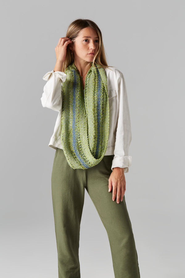 A knit accessory as jewelry, this cowl is worked in the round combining linen and drop needle stitches. A large needle is used to create a loose, drapey cowl which can be worn long, or doubled at the neck for a bit of color.