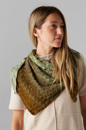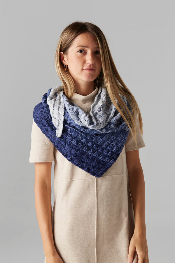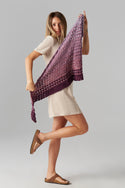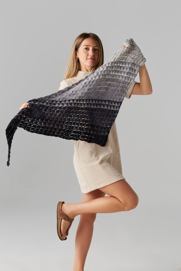 Wavy, motif-like wedges flow in a gradient of speckled and variegated shades to create an airy triangular shawl with a scalloped edge.