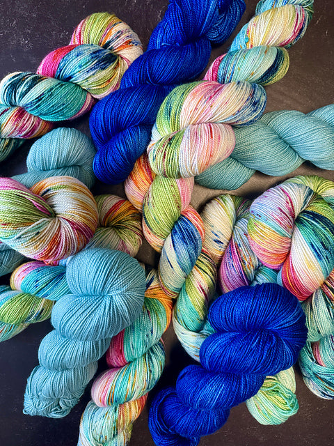 Colors in sample: 1 skein Love Your Store ‘25, 1 skein One Blue Love, & 1 skein Maldives
