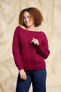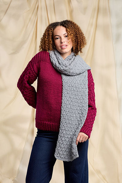 The scarf is knit flat from the bottom up. The cowl is worked in the round. The sweater is knit flat from the bottom up in pieces and seamed.