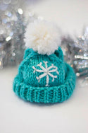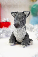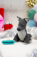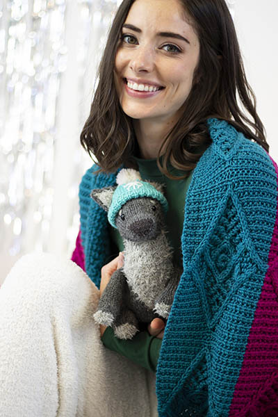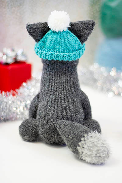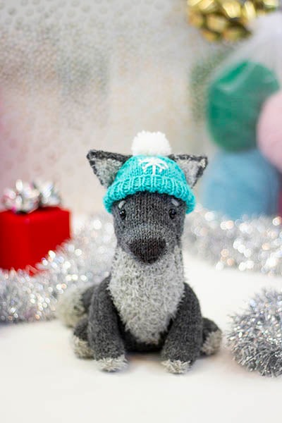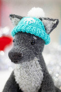 This festive boy loves romps in the woods and throwing snow up in the air with his nose. Although he may fancy himself a fierce Winter Wolf, he's often more of a puppy. His body is made in Deluxe Worsted 100% wool, while his shaggy chest and other accents are given their texture by soft Minou. Hubble's hat is removable, so you can give him head scratches with or without it!