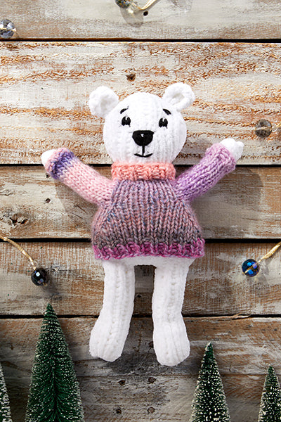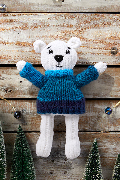 Marshmallow is knit in the round from the bottom up, beginning with his legs. Each leg is worked separately, and stitches are then cast on to join the legs and create his body. The body is worked in the round up to the neck, then his head is created. His arms and ears are knit separately and sewn to the body and head. His sweater is knit in the round from the bottom up.