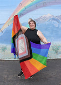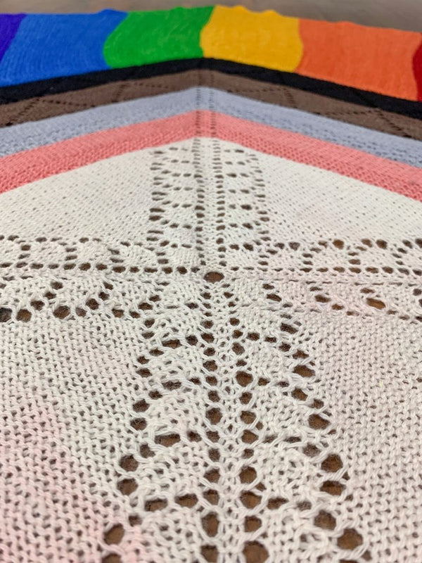This beautiful design is by the talented Marin Melchior, and in her own words, it's more of a symbol than a design. There are a few light lace and texture elements, but also a lot of garter in the ever-important (and longstanding) Rainbow section of this new flag.