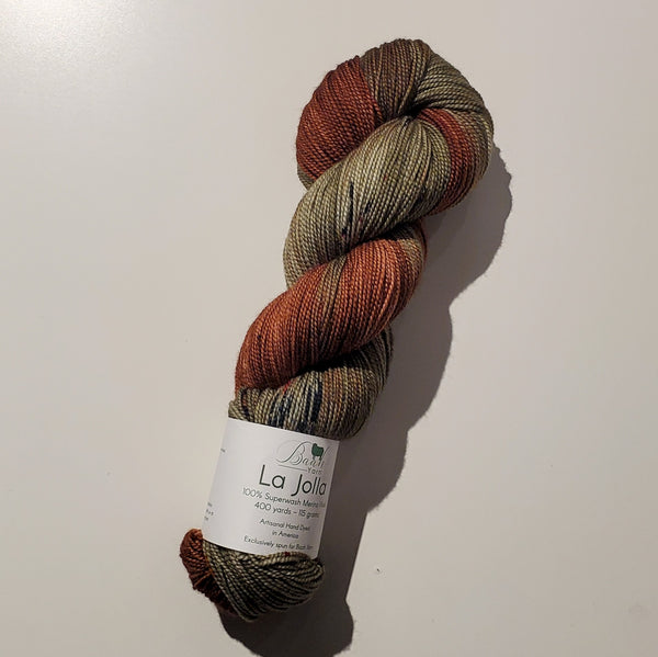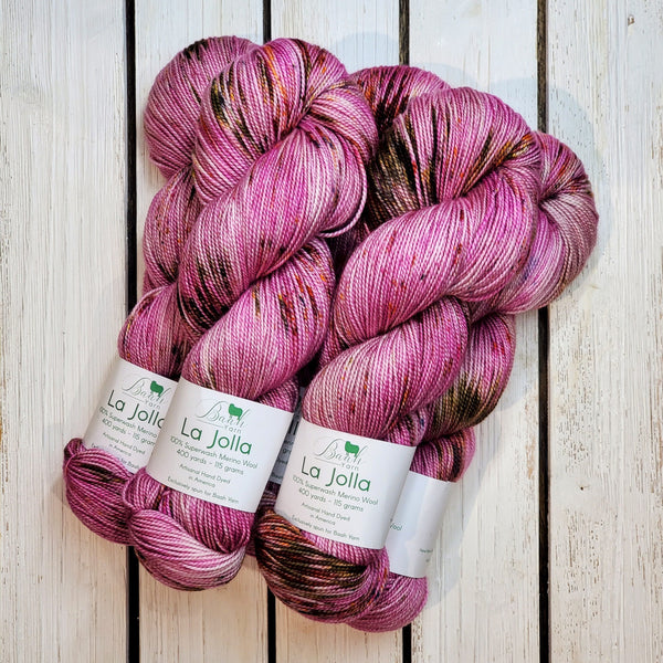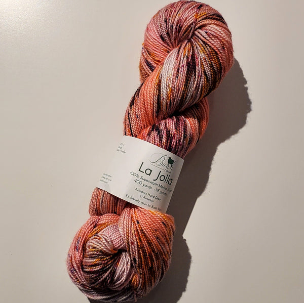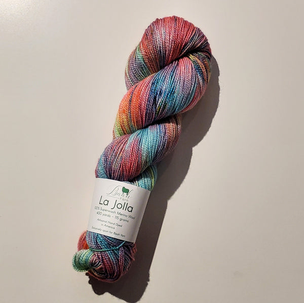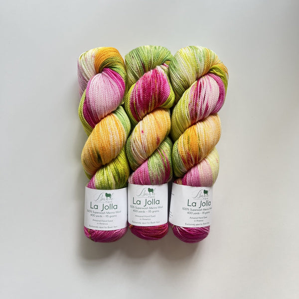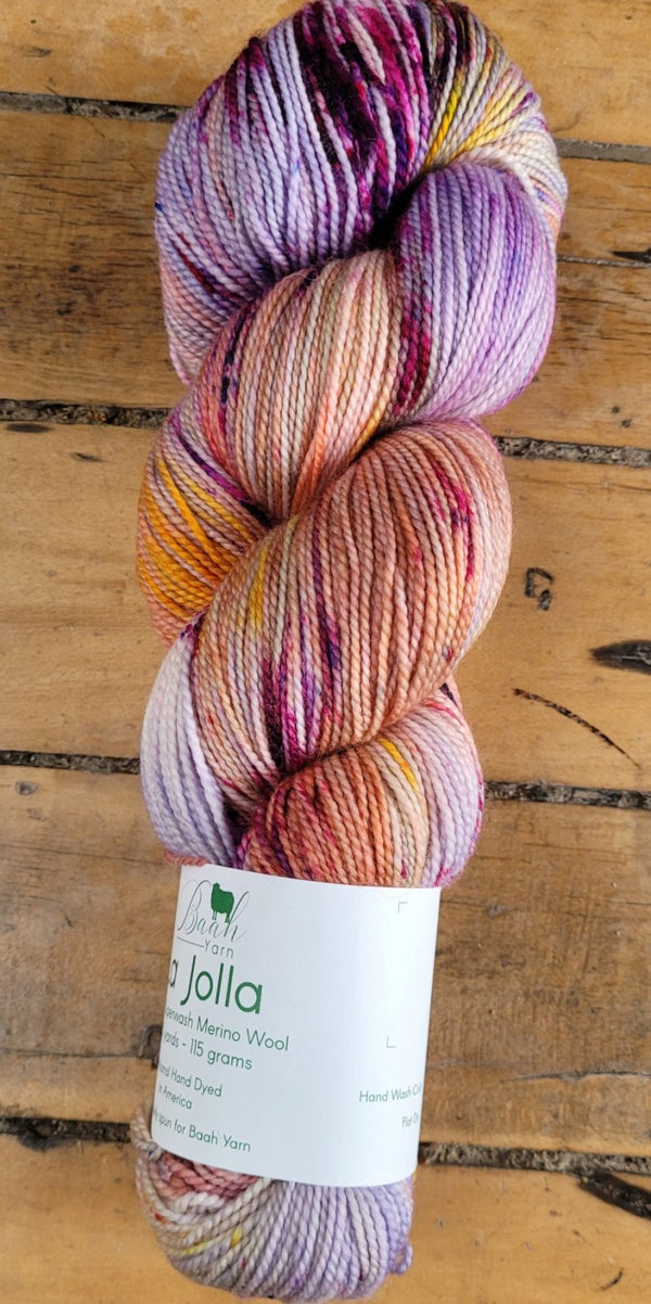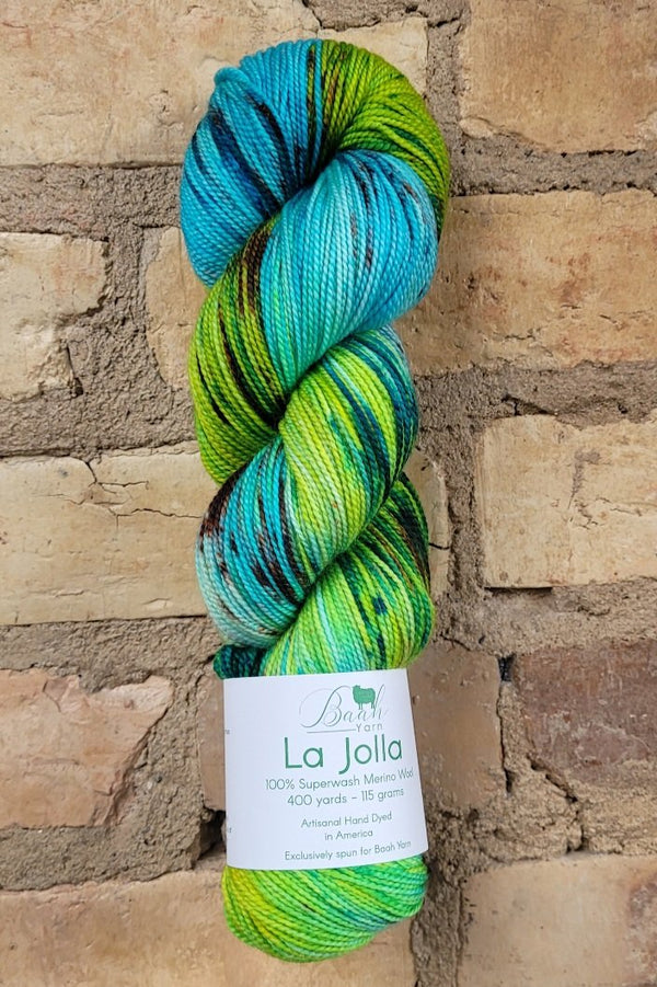 Baah Yarn La Jolla yarn is a luxurious yarn we've come to love for all of our lightweight projects. La Jolla comes in a beautiful selection of vibrant, saturated hues. The nice tight twist is PERFECT for socks, but also works up beautifully in a variety of projects such as shawls, light weight garments, fine accessories and baby or children’s items.