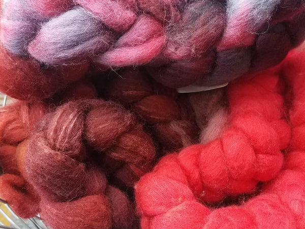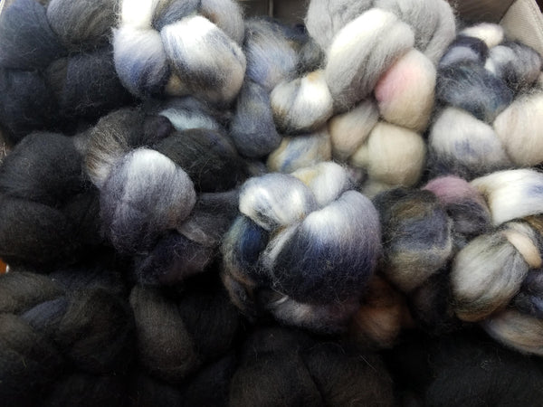 A while back we inherited several pounds of spinning fiber. Some were labeled with the fiber content, some were not. We have BFL, Alpaca, Merino, Rose fiber, Silk, Polwarth, Falkland, Camel, Firestar/Sparkle and more! Most are in braids, some are in batts. Come on in, or give us a call. We'll do our best to find something special for you. We have several un-dyed as well.