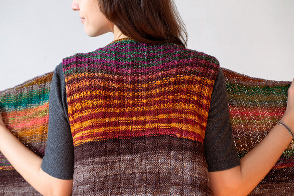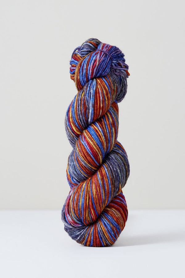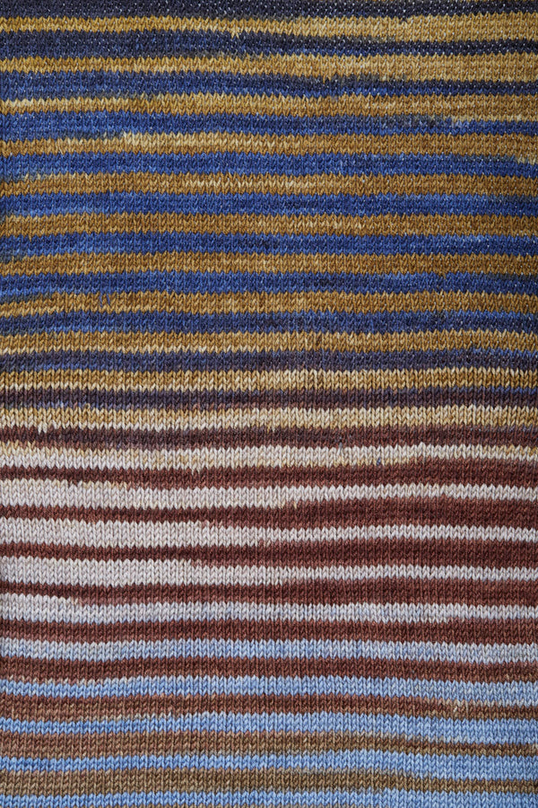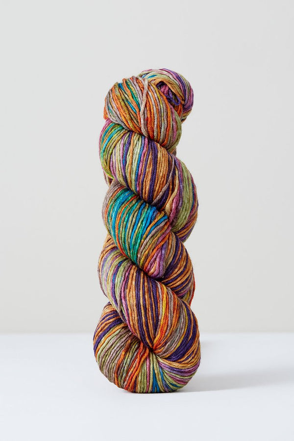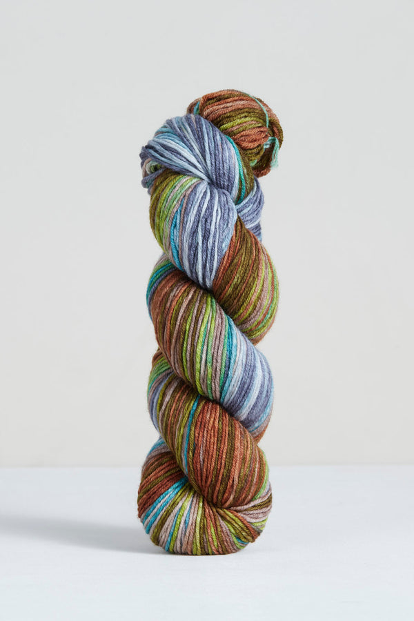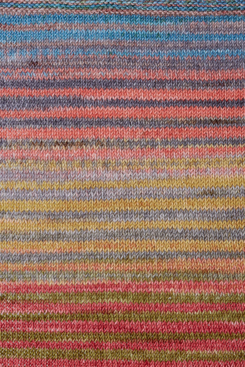 Uneek’s self-striping magic journeys through 4 sets of stripe pairs, subtly shifting between colors along the way, without the hassle of having to change yarns and weaving in all those loose ends. This yarn is a delight to work with, if just to see where the colors lead.